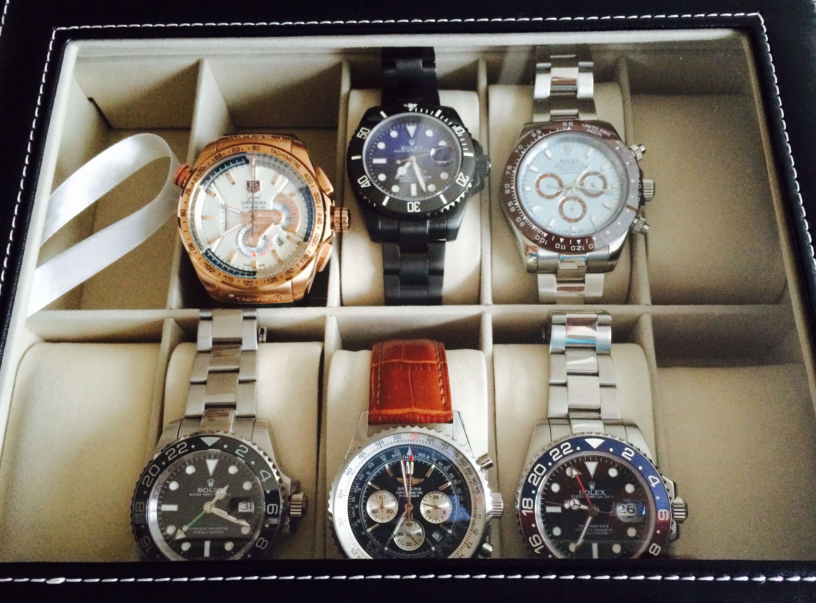 Ich präsentiere euch meine kleine "bescheidene" bisherige Sammlung. Es hat eine ganze Weile gedauert, ehe ich Sie zusammen hatte! Es handelt sich um hochwertige AAA-Plagiate (Automatikwerke und Quarzwerke).