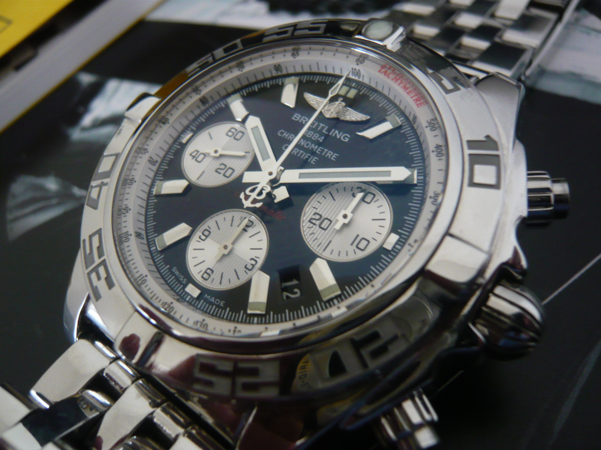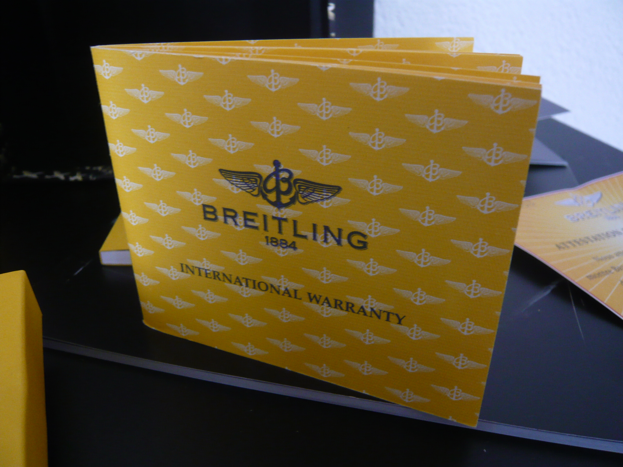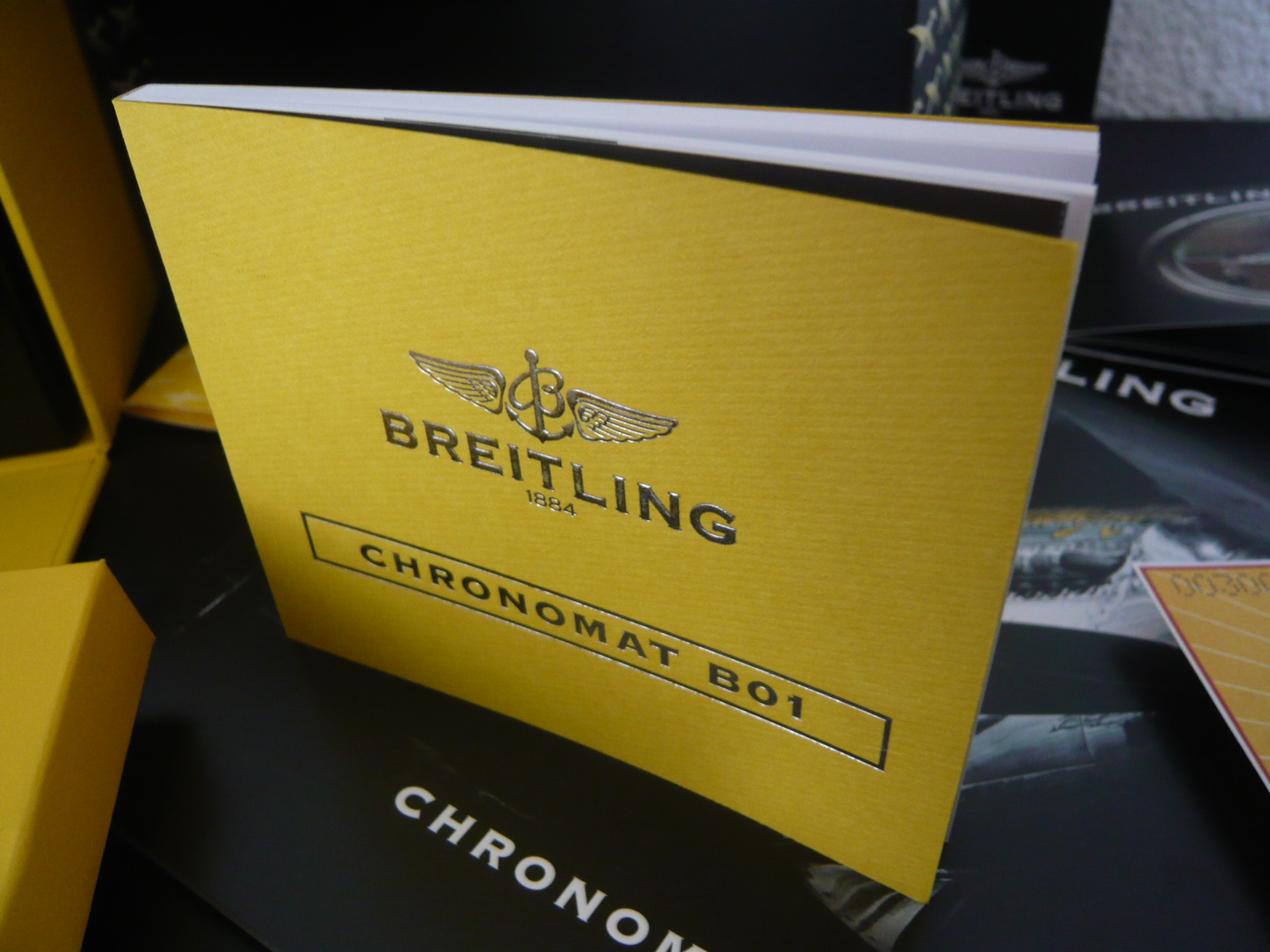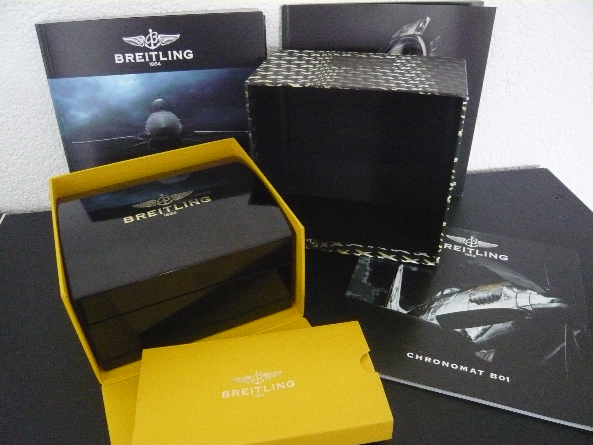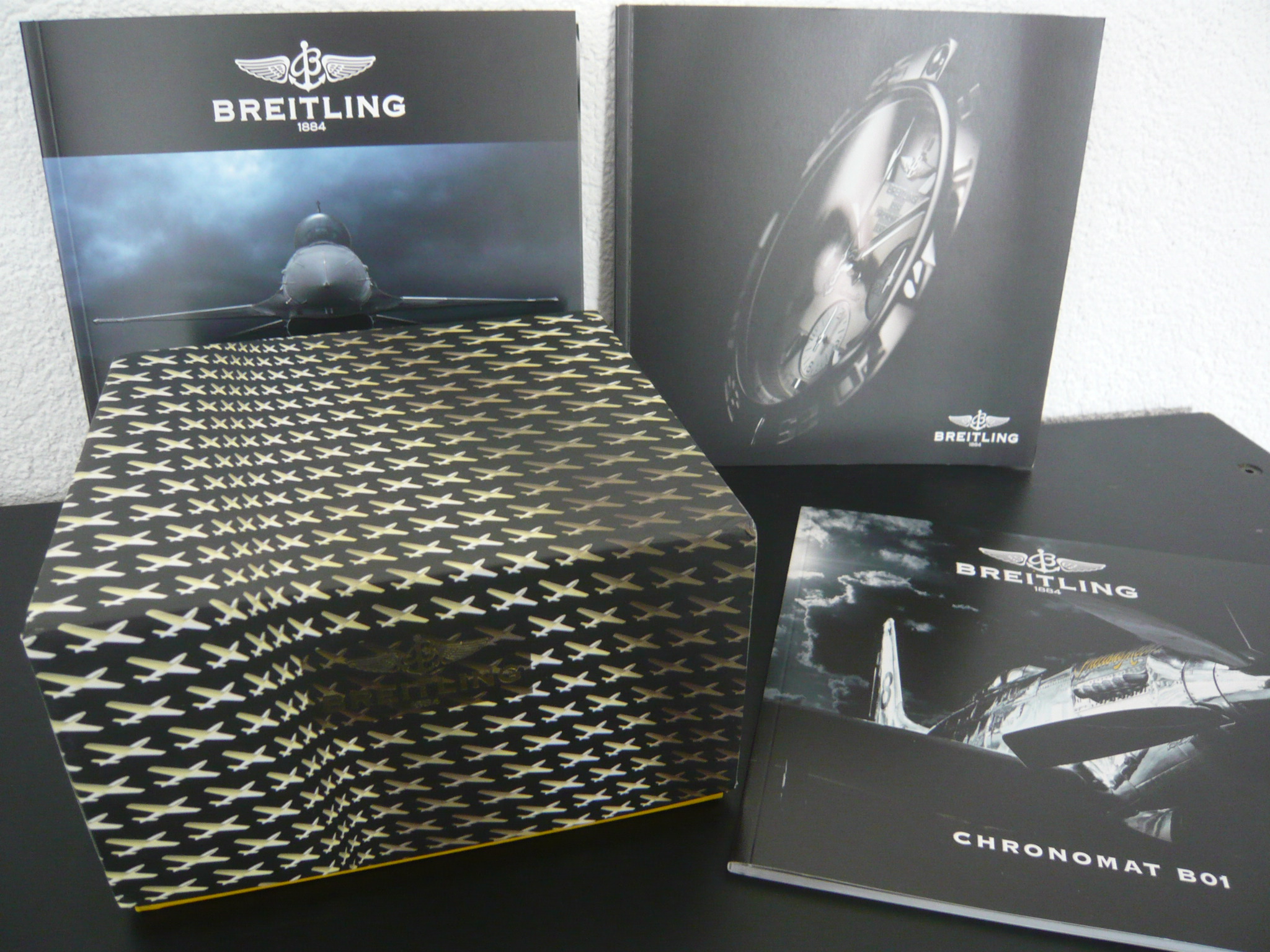 eine BREITLING CHRONOMAT B-01 in Carbonschwarz/weiße Subdials mit poliertem Stahlband und zusätzlichem mittelbraunem Krokolederband. In Originalbox und sämtlichen Originalpapieren, wie Anleitung, Garantiekarte, Zertifikat, Serviceheft und Siegel. Dazu die Pressemappe aus 2009 zur Vorstellung der Chronomat B-01, sowie Gesamtkatalog Breitling mit Preisliste und separatem Prospekt der B-01 mit allen Farbkombinationen. Hat mich eine Menge Nerven gekostet, das alles aufzutreiben. Hat sich aber gelohnt, wie ich finde.