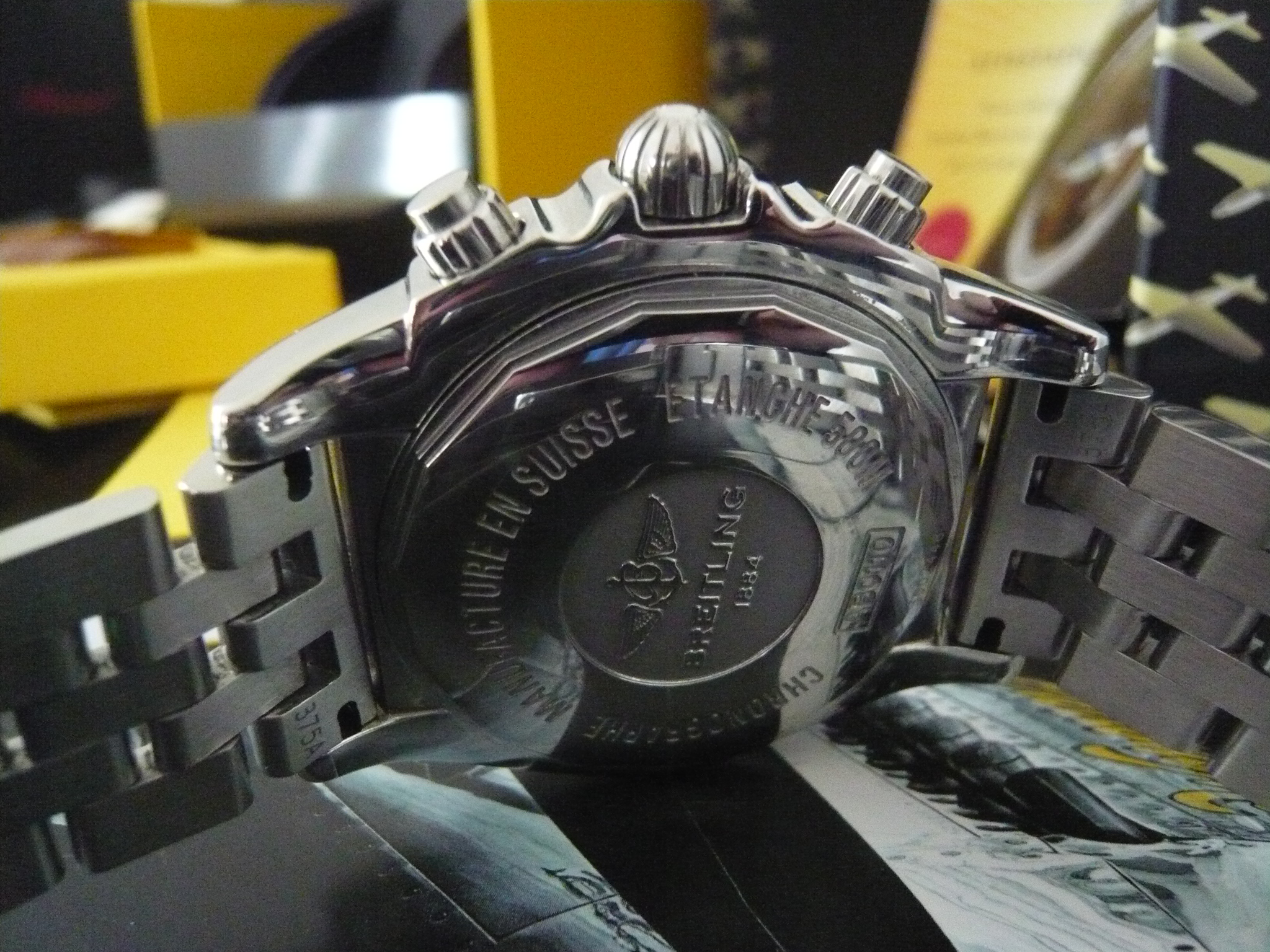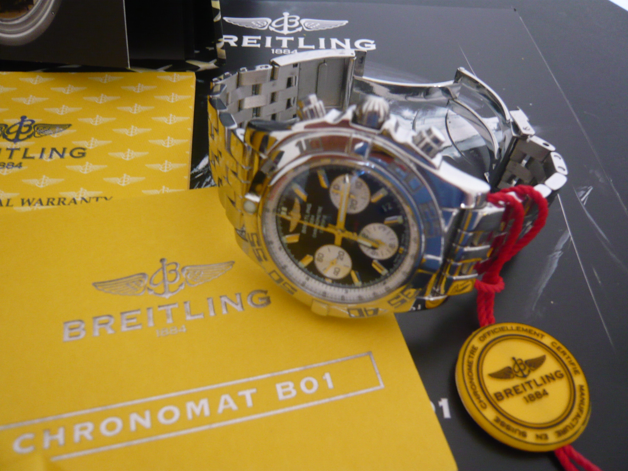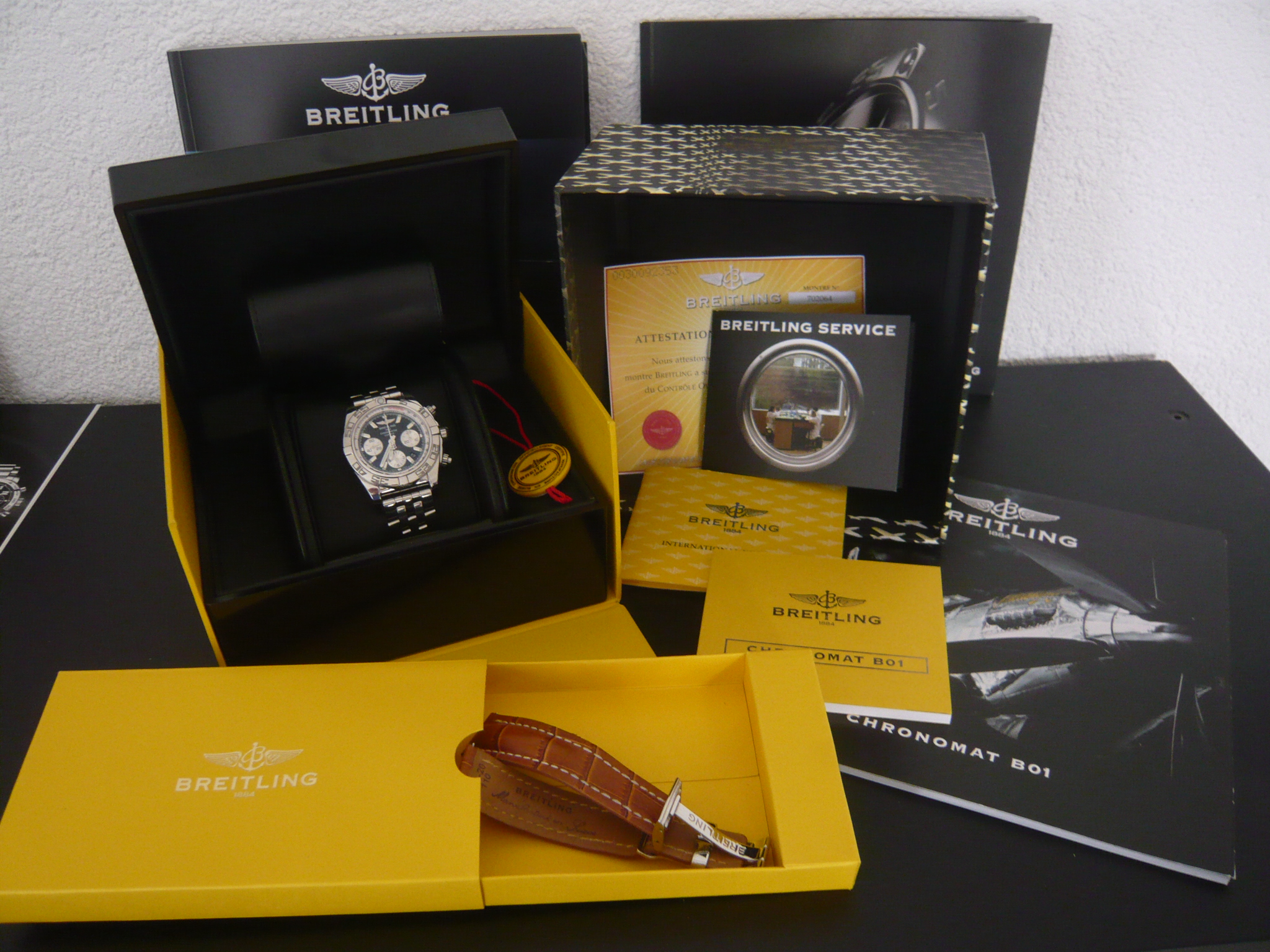 eine BREITLING CHRONOMAT B-01 in Carbonschwarz/weiße Subdials mit poliertem Stahlband und zusätzlichem mittelbraunem Krokolederband. In Originalbox und sämtlichen Originalpapieren, wie Anleitung, Garantiekarte, Zertifikat, Serviceheft und Siegel. Dazu die Pressemappe aus 2009 zur Vorstellung der Chronomat B-01, sowie Gesamtkatalog Breitling mit Preisliste und separatem Prospekt der B-01 mit allen Farbkombinationen. Hat mich eine Menge Nerven gekostet, das alles aufzutreiben. Hat sich aber gelohnt, wie ich finde.