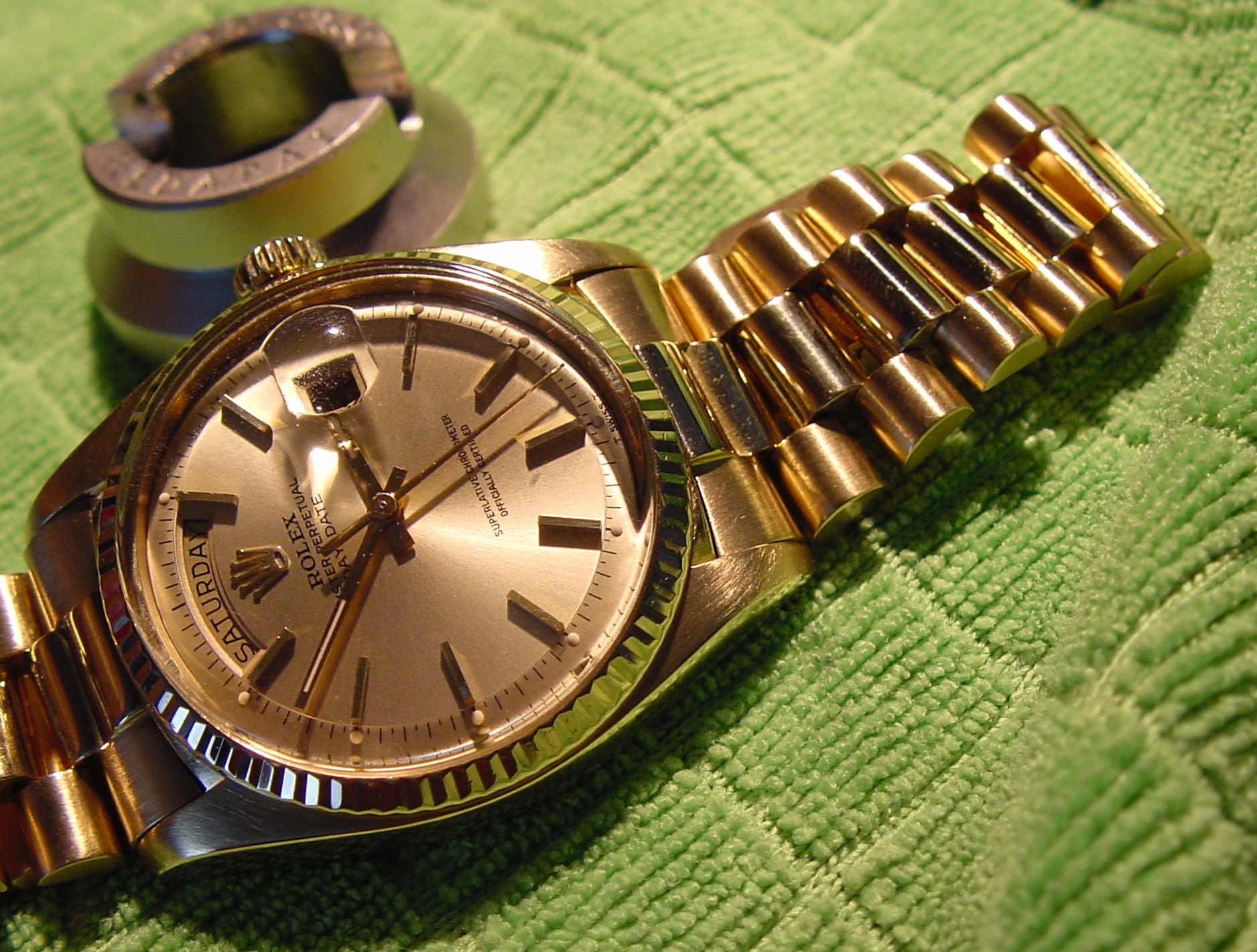 Eine Rolex Day-Date 1803 von 1975 mit President Band in 750er Gelbgold. Natürlich mit Plexiglas