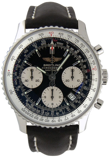schwarzes Zifferblatt, weißer Ring, weiße Subdials, Lederband.