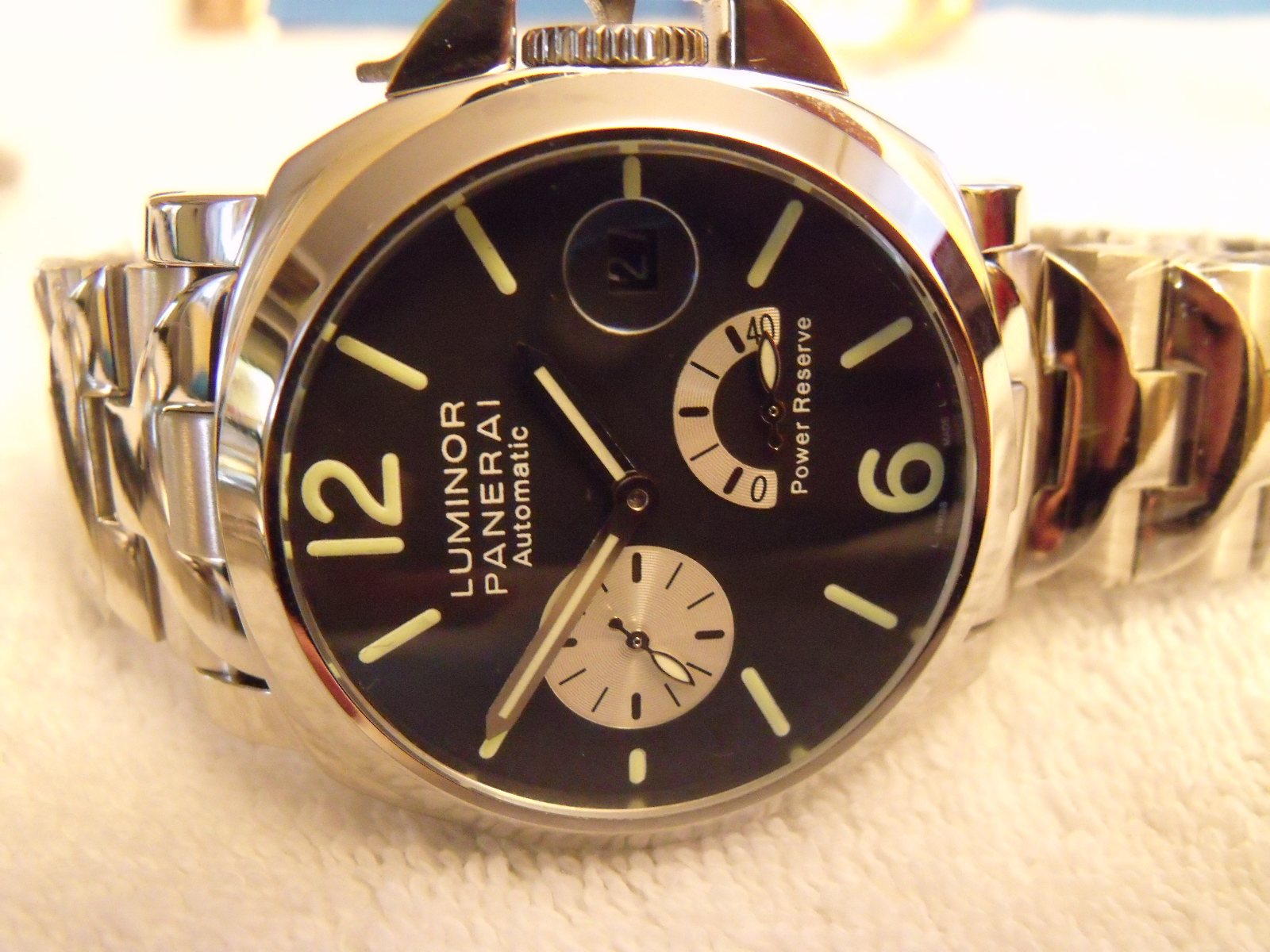 Tut mir leid, aber SEHR schlechte ausführung: Datum unsichtbar, die Krone sitzt wie festgeklebt auf dem Gehäuse, der Crownguard sieht komisch aus (irgendwie zu hoch), die Farbe auf den Zahlen ist zu leuchtend grün und bessere Bracelets habe ich auch gesehen