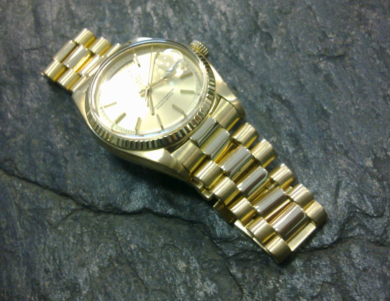 Eine Rolex Day-Date 1803 von 1975 mit President Band in 750er Gelbgold. Natürlich mit Plexiglas