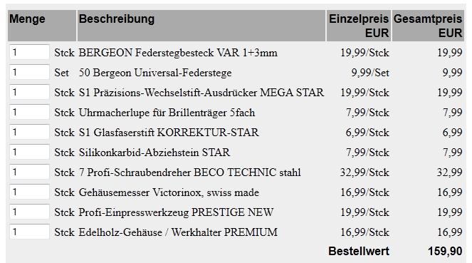 Es muss nicht alles von Bergeon sein, der Profi-Marke, aber man sollte schon darauf achten hohe Qualität zu bekommen. Ich habe vor eingier Zeit einen Schwung Werkzeug bei http://www.uhrenwerkzeug.com bestellt. Ich habe mit jedem einzelnen Teil gute Erfahrungen gemacht und nutze alles oft.