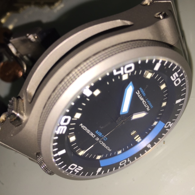 ich habe eine solche Porscheuhr günstig bekommen, ist allerdings etwas mitgenommen: Armband gerissen, Lünette (fest mit Glas verbunden) hat Spiel und einer der kleinen Drucktaster fehlt. Die ganze Uhr lässt sich nach oben herausklappen.