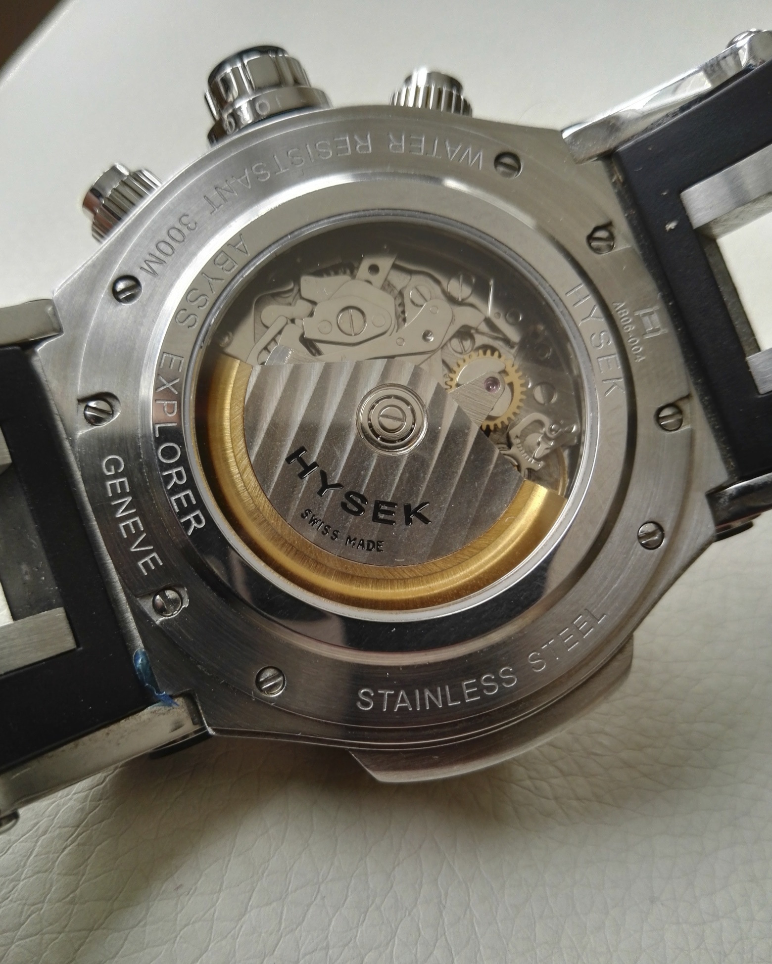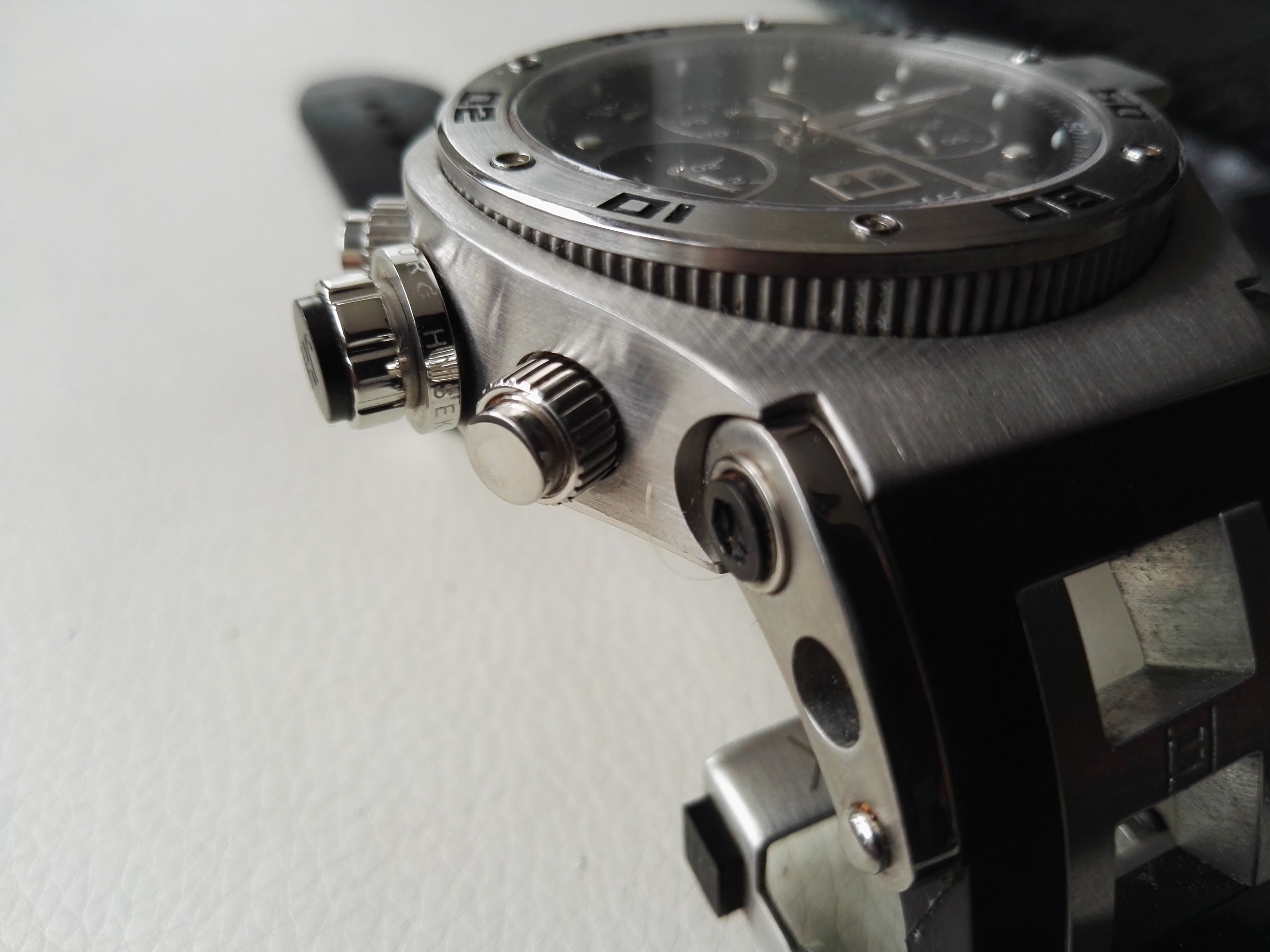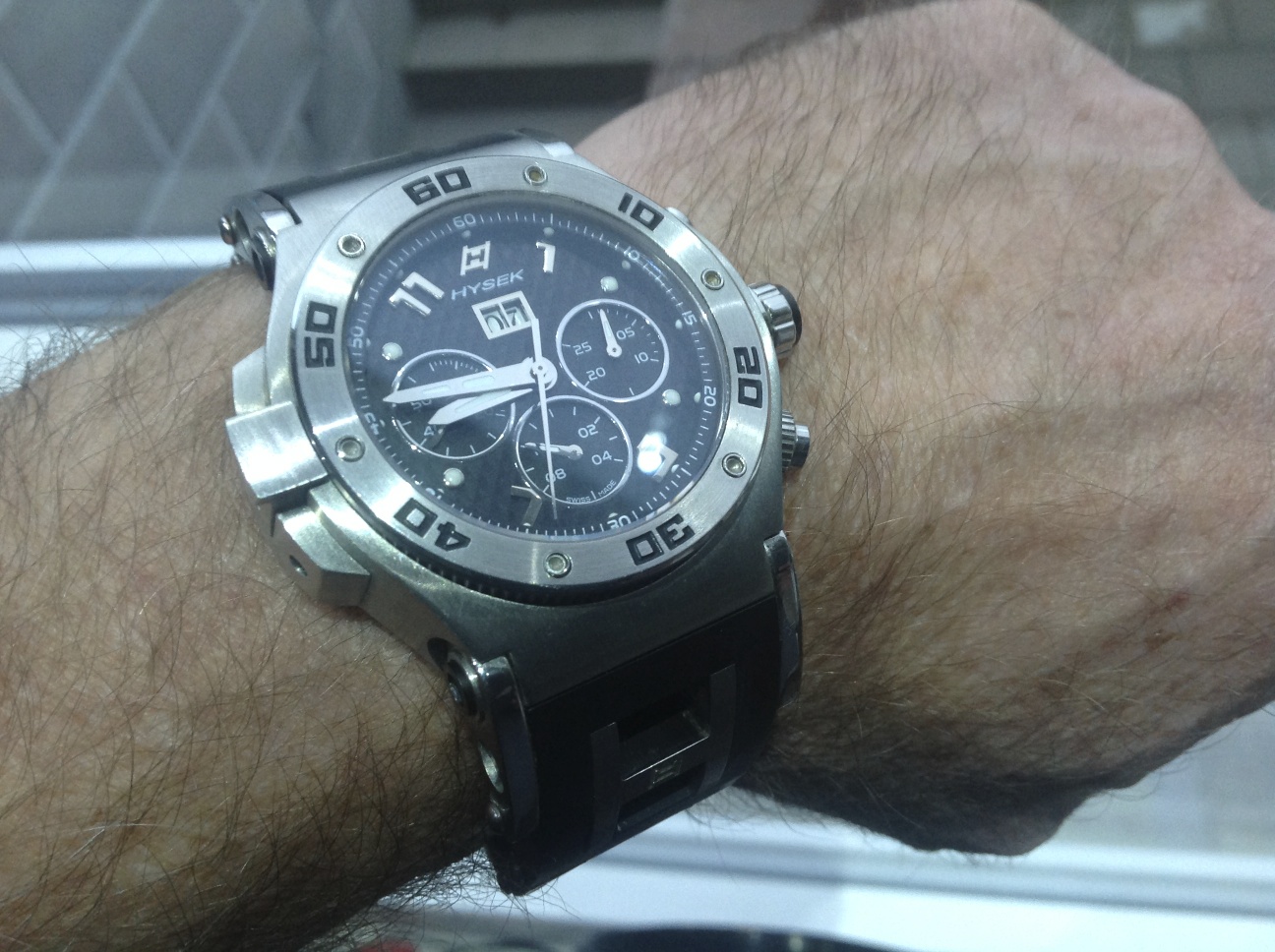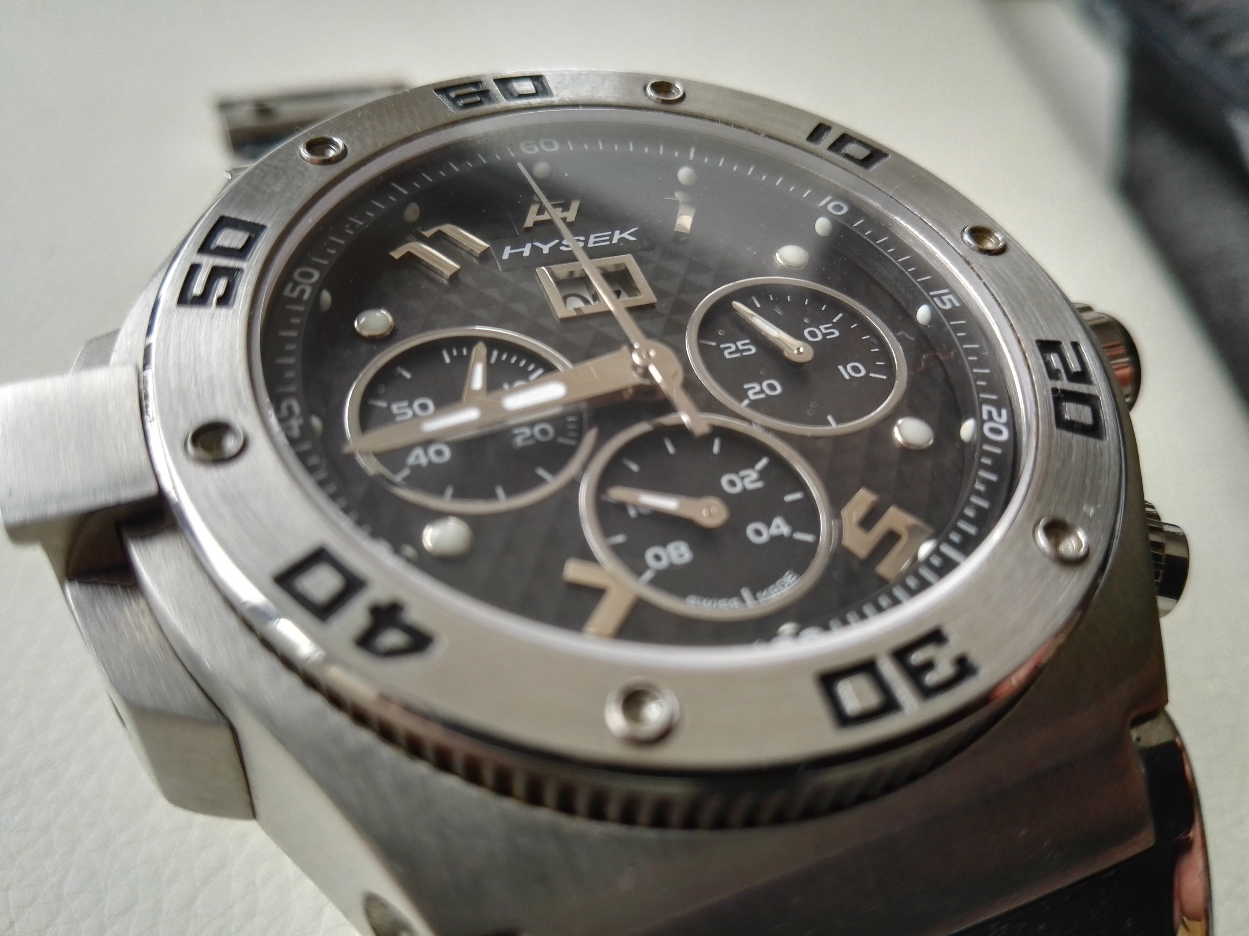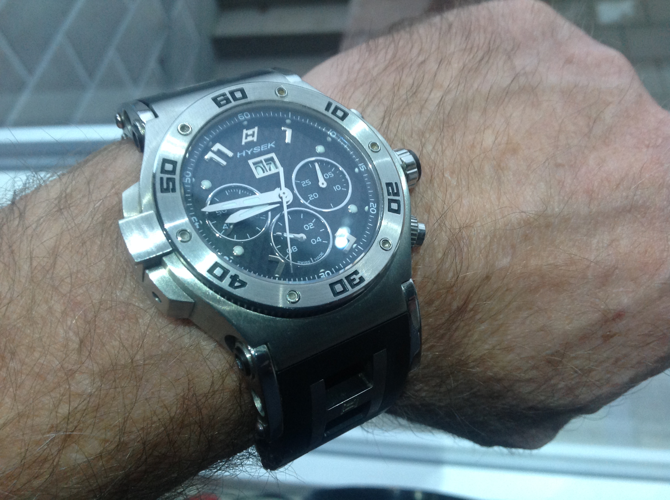 Meine Hysek eine richtig schwere Uhr,und 58mm mit Krone, auch nicht gerade klein!Verschraubte Drücker,und mit Asia 7750 Werk ,das top läuft.
