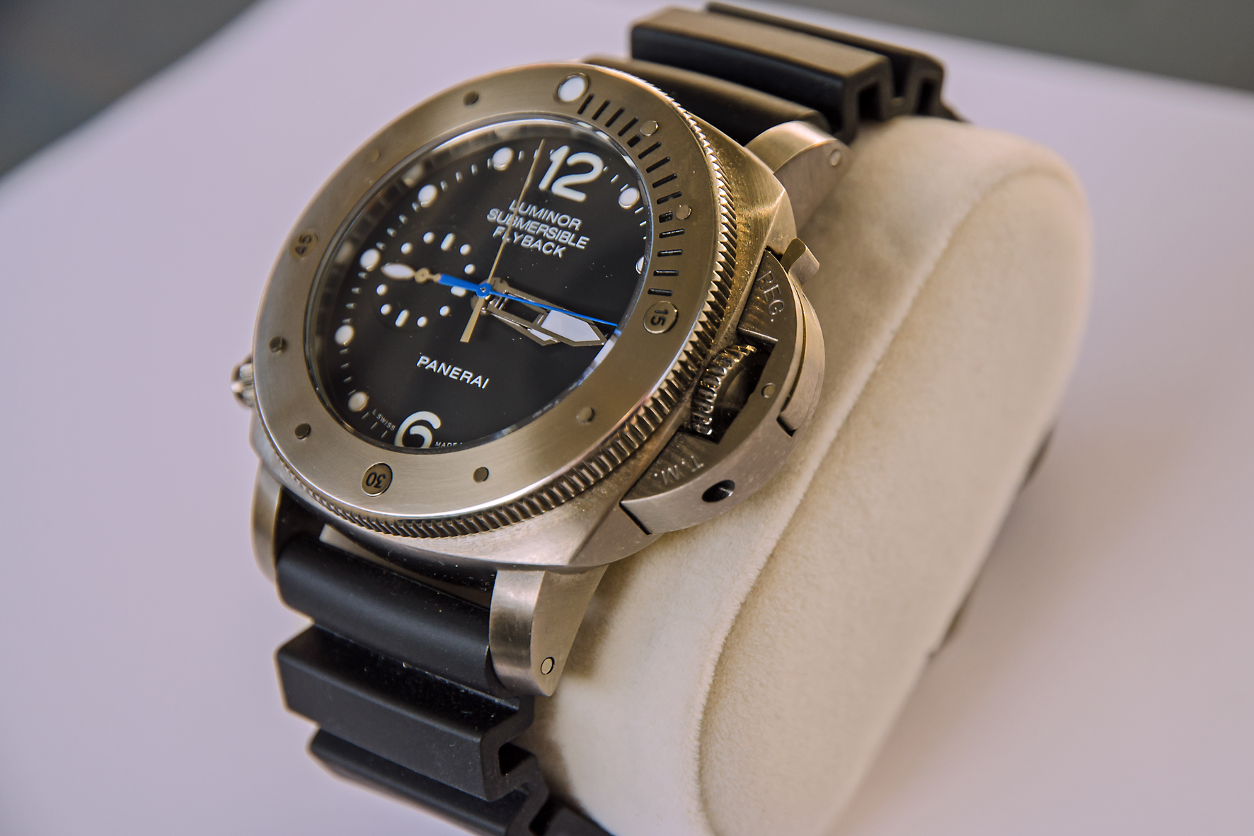 Was bei der Panerai schon mal sofort auffällt, ist der falsche Stundenzeiger und der nicht sauber bündig schließende Hebel am CG. Leider sieht man das Datum nicht.