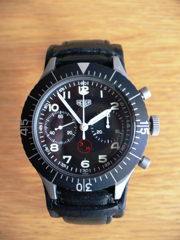 Habe letztes Jahr in Shanghai eine HEUER gekauft, die eigentlich gar keine Replica-Uhr ist, denn ich habe sie noch nirgends im Original entdecken können. Trotzdem möchte ich sie hier einmal vorstellen., denn der Designer könnte sich etwas dabei gedacht haben. Ender der 60er Jahren hat die Fa.HEUER (noch vor der Fusion mit TAG) im Auftrag der Bundeswehr einen Chronographen für die Piloten entwickelt, die nie im öffentlichen Verkauf waren. Viele Jahre später hat die Fa.SINN noch vorhandene Exemplare aufgekauft und unter eigenem Namen vertrieben.