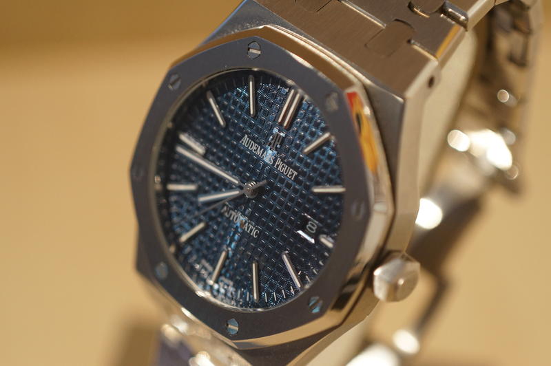 ich suche eine Audemars Piguet Royal Oak mit silbernem Armband und schwarzem Ziffernblatt.