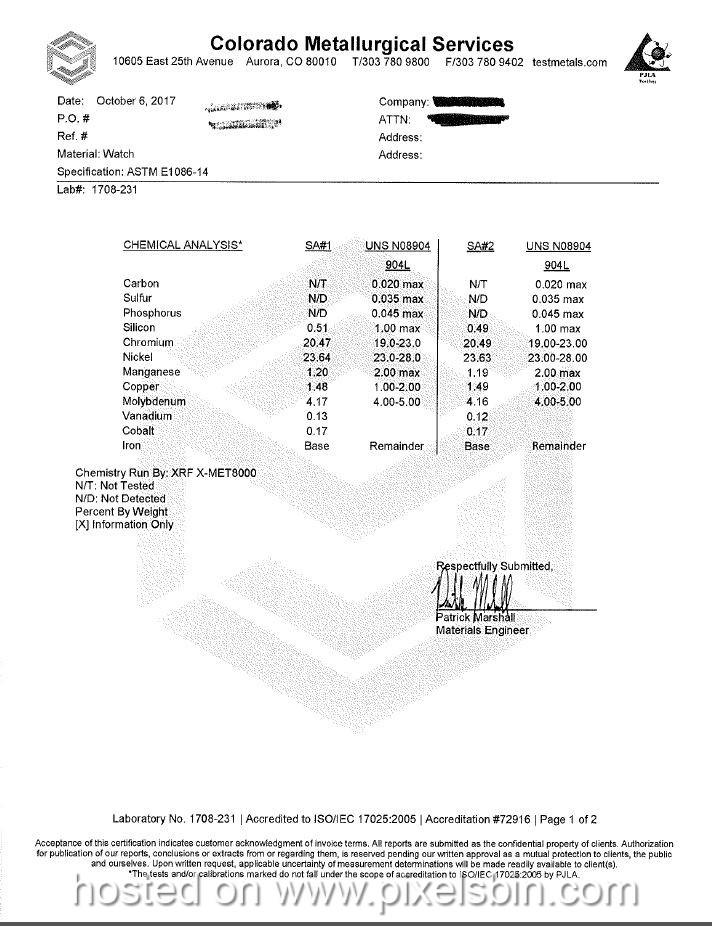 Es wurden Gehäuse, Armband und Schließe getestet. Sieht eigentlich nicht so schlecht aus. Wobei auch mir der Vorteil von 904L Stahl nicht klar ist.
