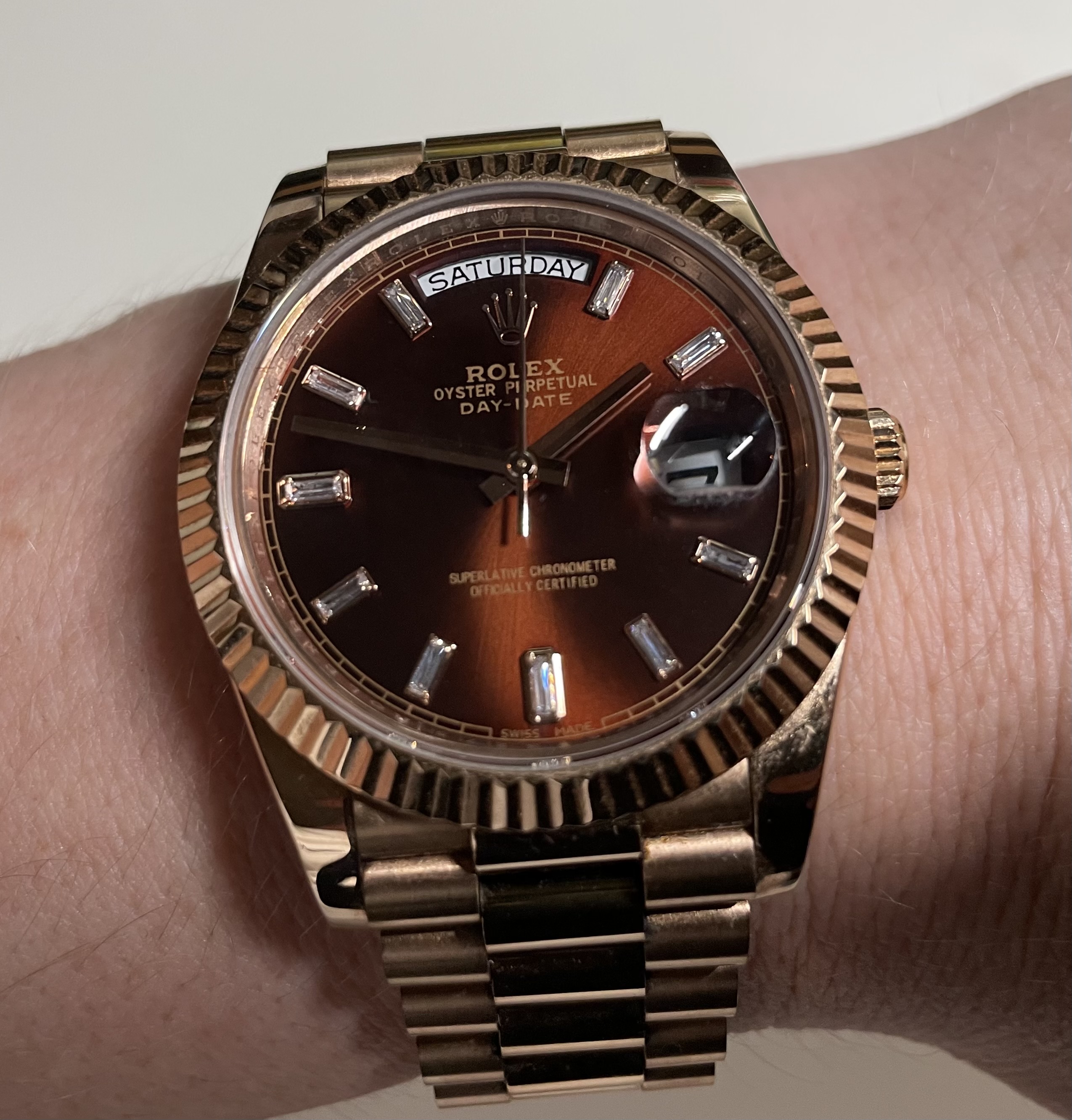 Biete eine sehr schöne Rolex Day-Date 40 mm in Everose Gold mit Chocolate Zifferblatt und sehr gutem Asian 2836 Automatikwerk. 18k vergoldet, Edelstahl. Keine Gebrauchsspuren. Detaillierte Bilder und Preis gerne auf Anfrage.
